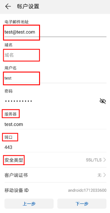 3、输入邮箱地址、用户名(域登陆时需要填写域账号)、密码,点“手动设置”。填写服务器、端口、安全类型,点击下一步。如果能顺利进入下一步,并开始同步邮件,则配置成功。