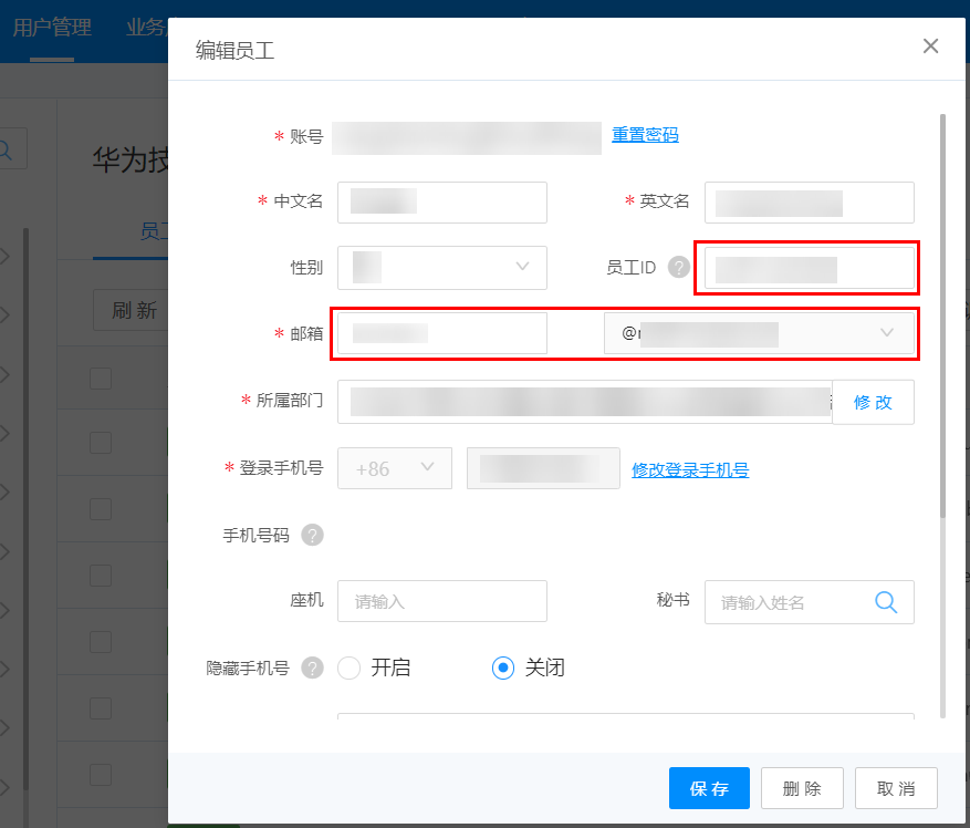 开启域登陆时,需要在“用户管理”的“员工ID”填写邮箱的登录名。
