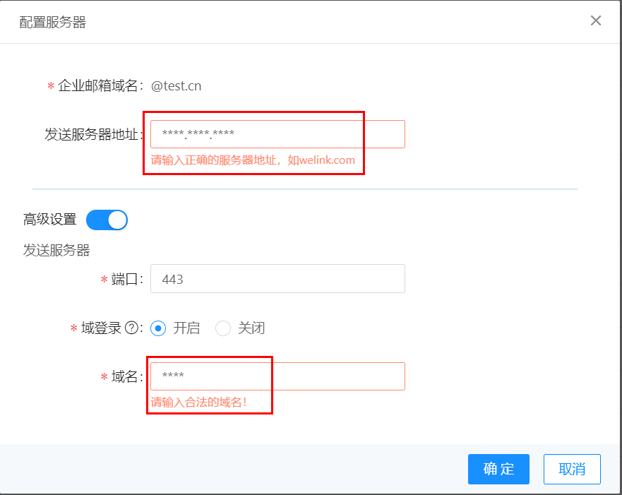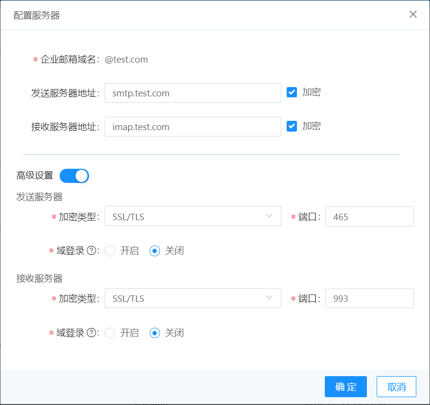 注意:如果邮箱的登陆名不是邮箱地址,需要勾选“域登陆”,此时会使用用户管理中的“员工ID”作为邮箱的登陆名。IMAP开启“域登陆”不用填写“域名”。