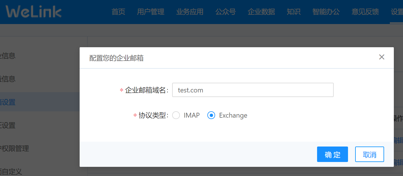在2.2节中验证邮箱能够配置成功后,便可在WeLink后台管理中进行邮箱配置。打开网址http://welink.huaweicloud.com/,登陆WeLink后台管理。点击“设置”,“邮箱设置”,进入到如下图所示界面。