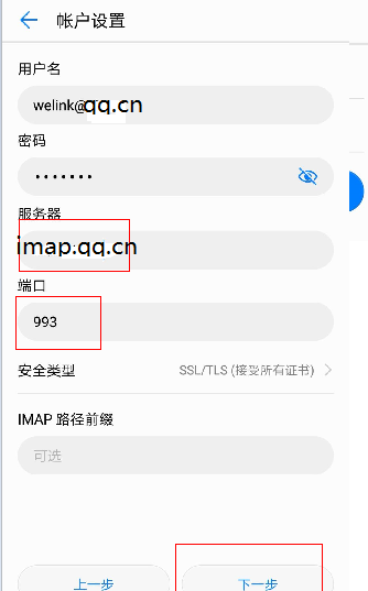 注意:先验证通道加密端口993,如果不行就用通道不加密143